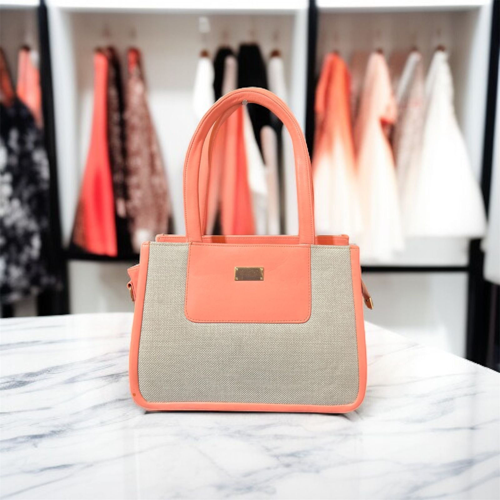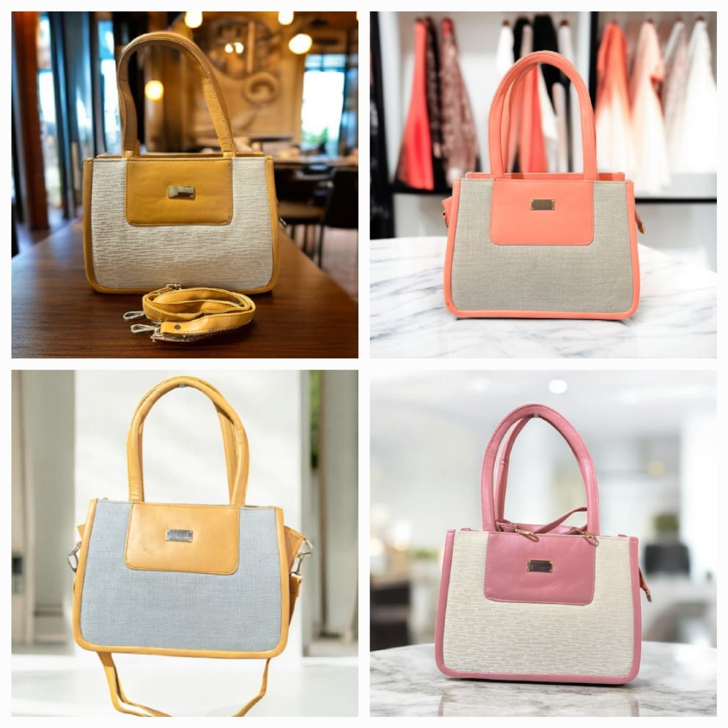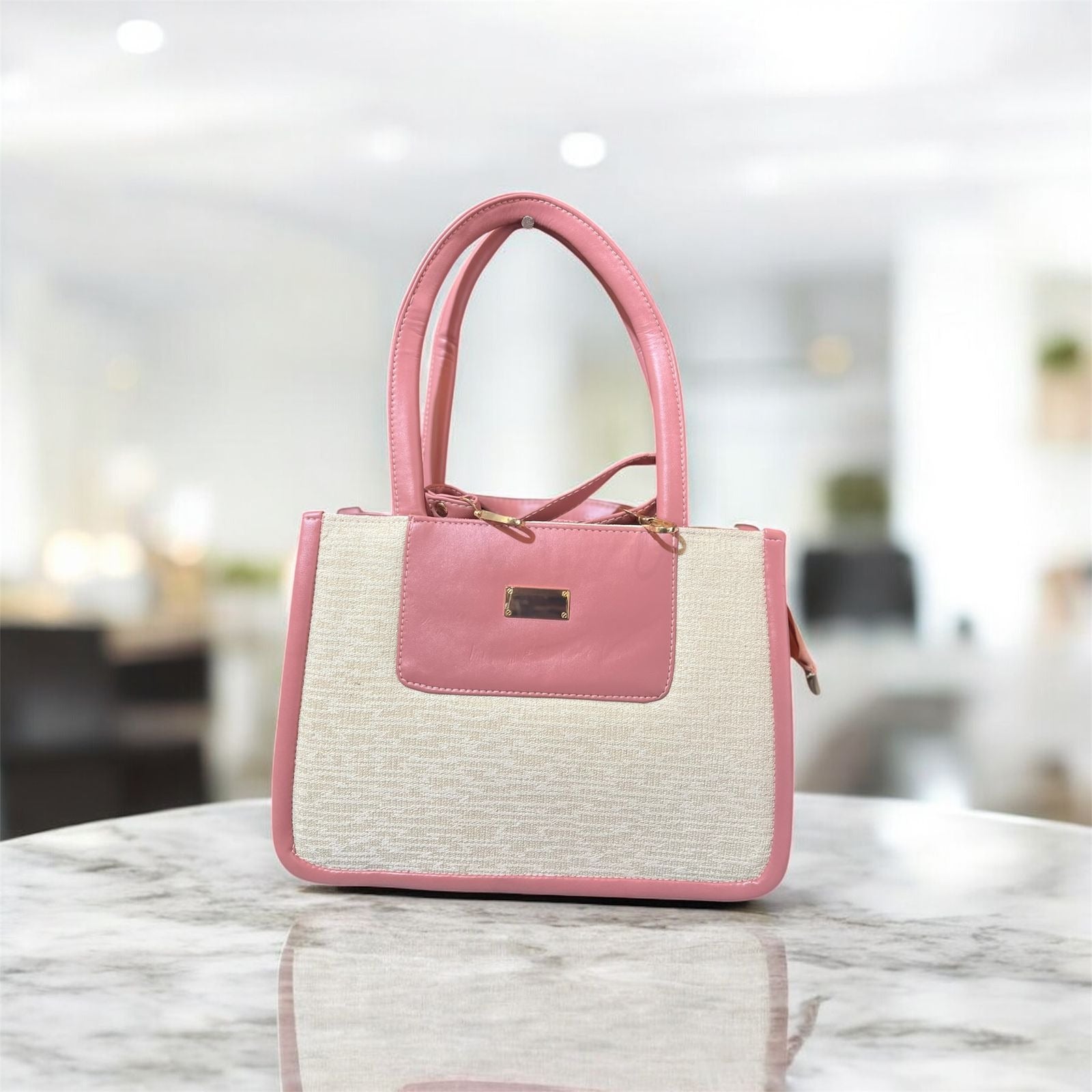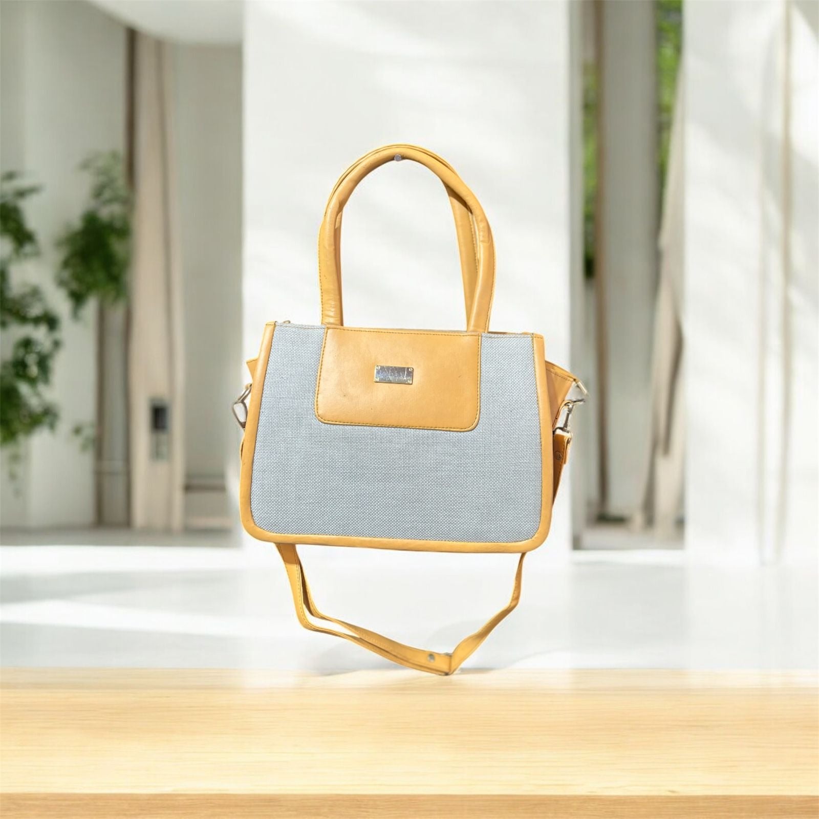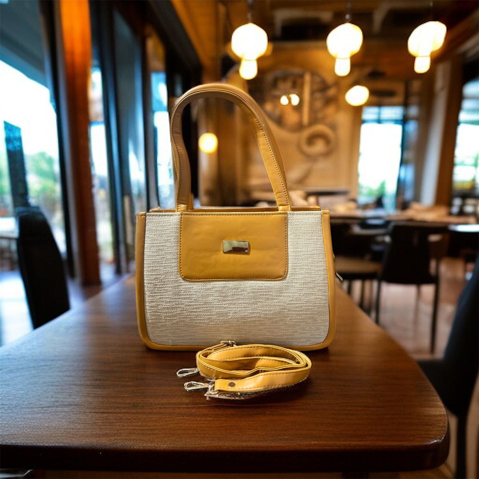 A beautifully designed two-tone tote featuring a textured beige base paired with a rich mustard faux-leather finish. Its structured look, premium detailing, and soft shine make it perfect for office, university, lunches, and everyday outings.