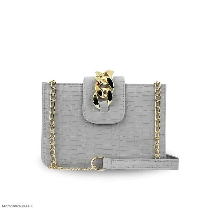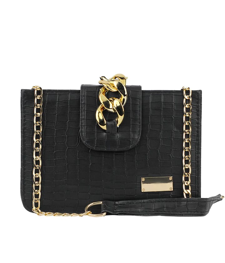 Shop the elegant CRB Croco Chain Bag by Dropshop by Hassaan Raza. Made from premium croc-textured faux leather with a top zipper and long metal chain. Perfect for parties and everyday chic style.