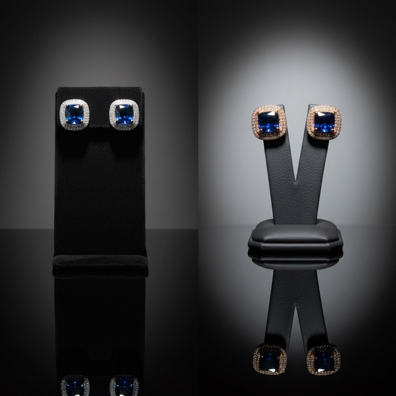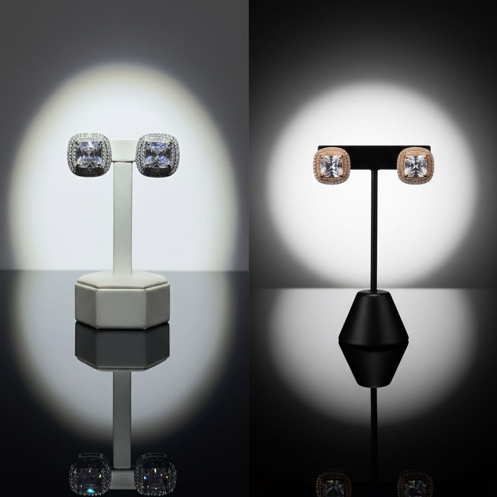 Discover our stunning collection of square-cut gemstone stud earrings in elegant hues like black, sapphire blue, rose pink, amber, turquoise, and iridescent crystal. Each pair is crafted with precision and surrounded by sparkling pavé accents for timeless sophistication. Perfect for any occasion or gift.