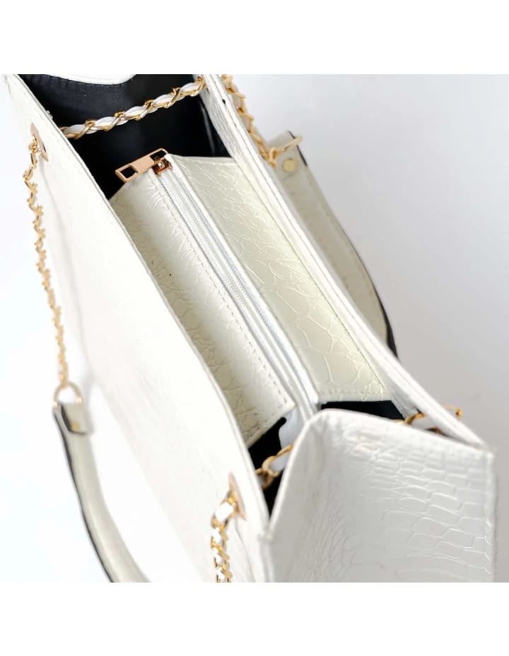 Elevate your everyday look with this stylish faux leather tote bag featuring a sleek croco texture. Designed with a durable parachute lining, it ensures long-lasting use while keeping your essentials secure. The 12 × 9.75 × 4.5 inches size offers ample space, and the sturdy handle with long chain strap makes it perfect for both hand carry and shoulder wear.